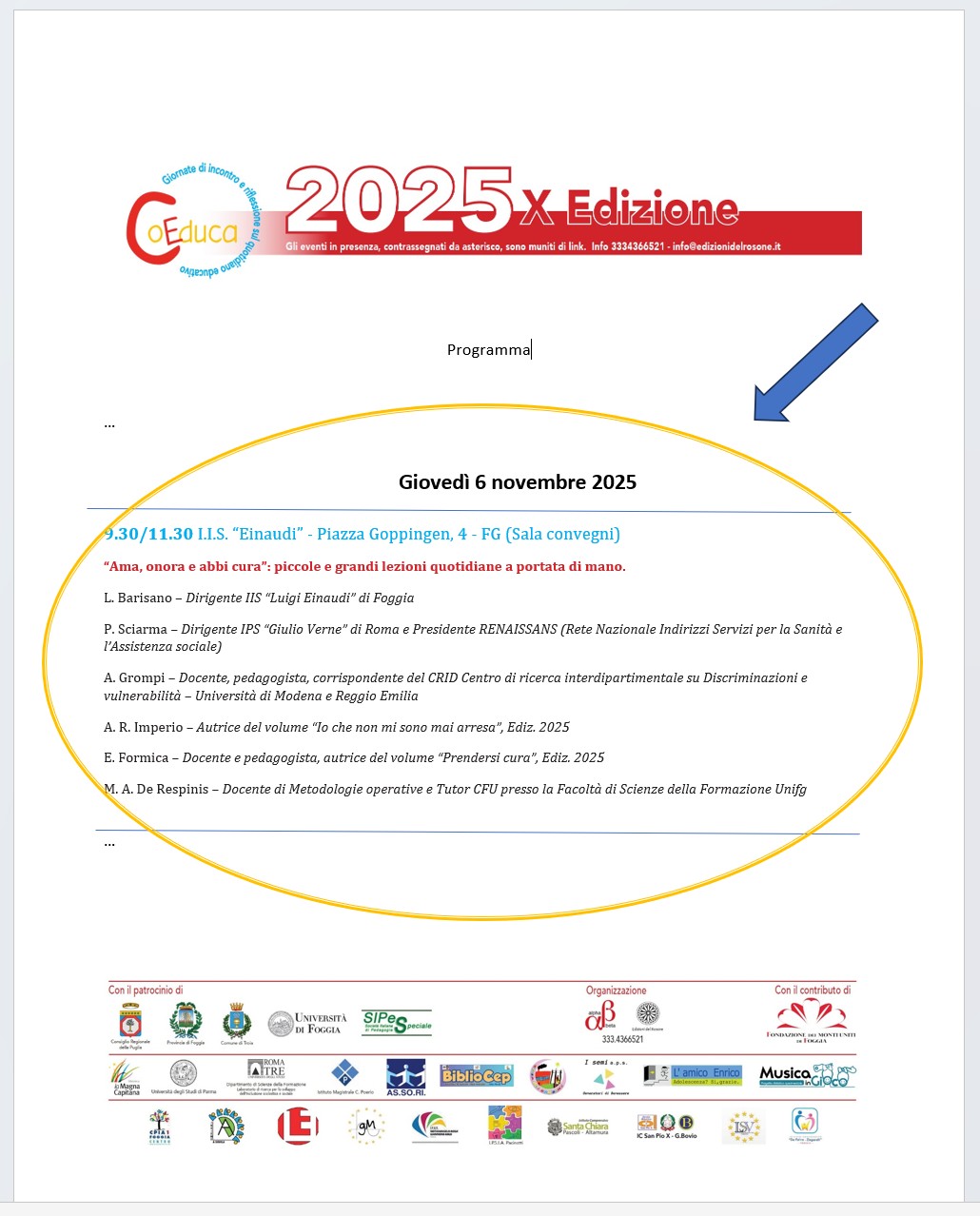 L’Einaudi anche quest’anno protagonista nella decima edizione di “CoEduca 2025″, il programma di seminari e incontri con giornate di riflessione sul quotidiano educativo, che si svolgerà nella città di Foggia a partire dal 5 novembre. Organizzato dalle Edizioni del Rosone di Foggia, con il patrocinio del Consiglio Regionale della Puglia, della Provincia di Foggia, dell’Università di Foggia e dalla SIPES (Società Italiana di Pedagogia Speciale), l’evento vuole essere uno spazio di condivisione, un’opportunità di dialogo e di crescita individuale e collettiva, per una Pedagogia di comunità che apra nuovi orizzonti per il nostro territorio e le nuove generazioni.